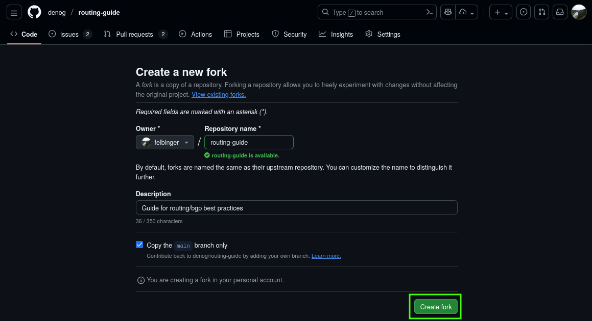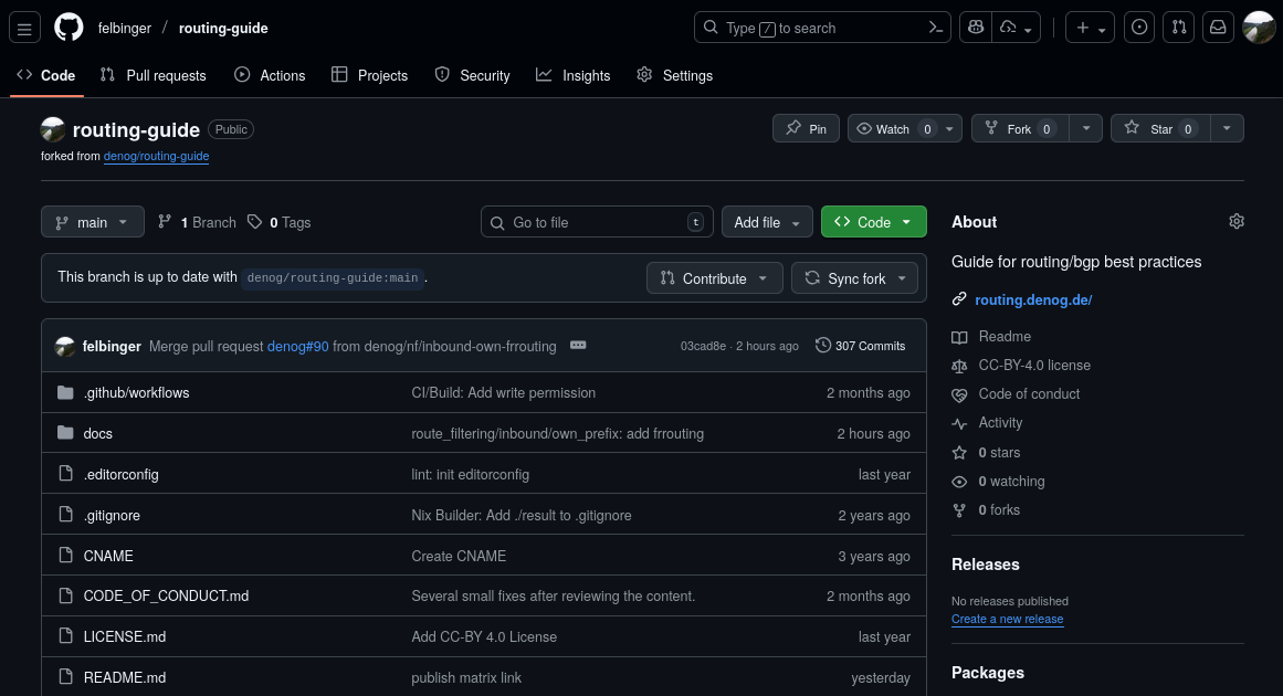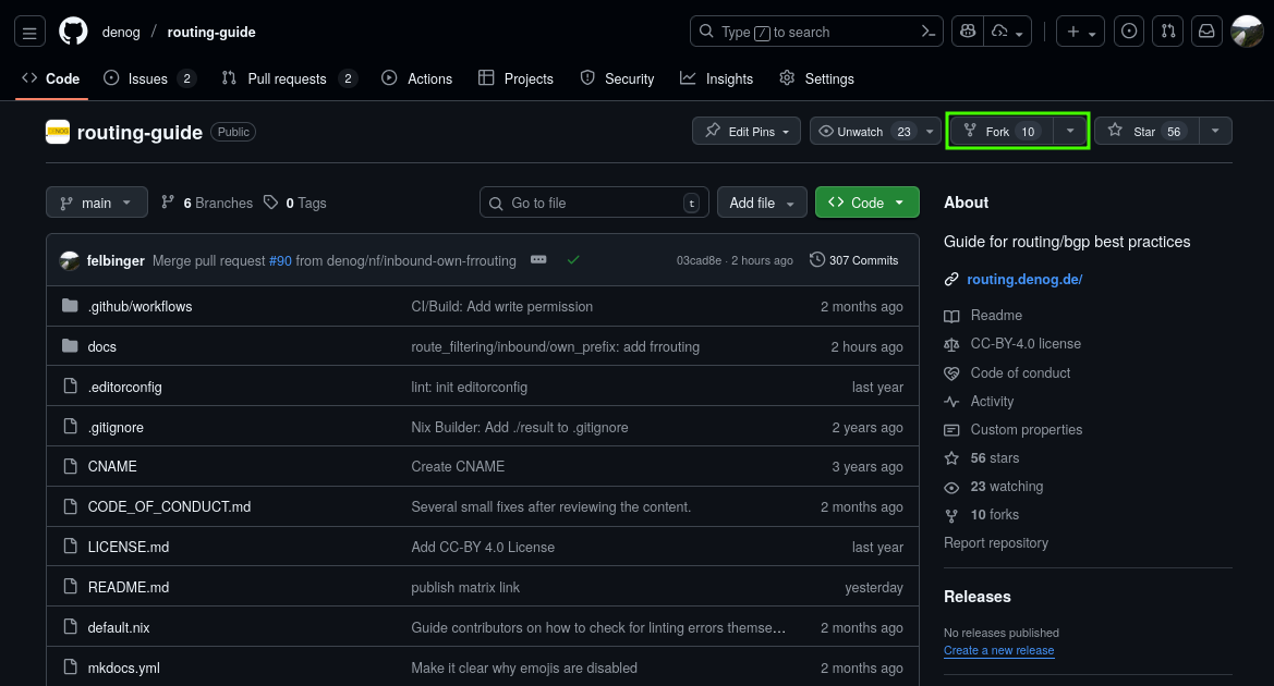 If you're an external contributor (not a maintainer of the DENOG Routing Working Group), start by forking the repository on GitHub.